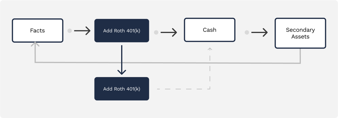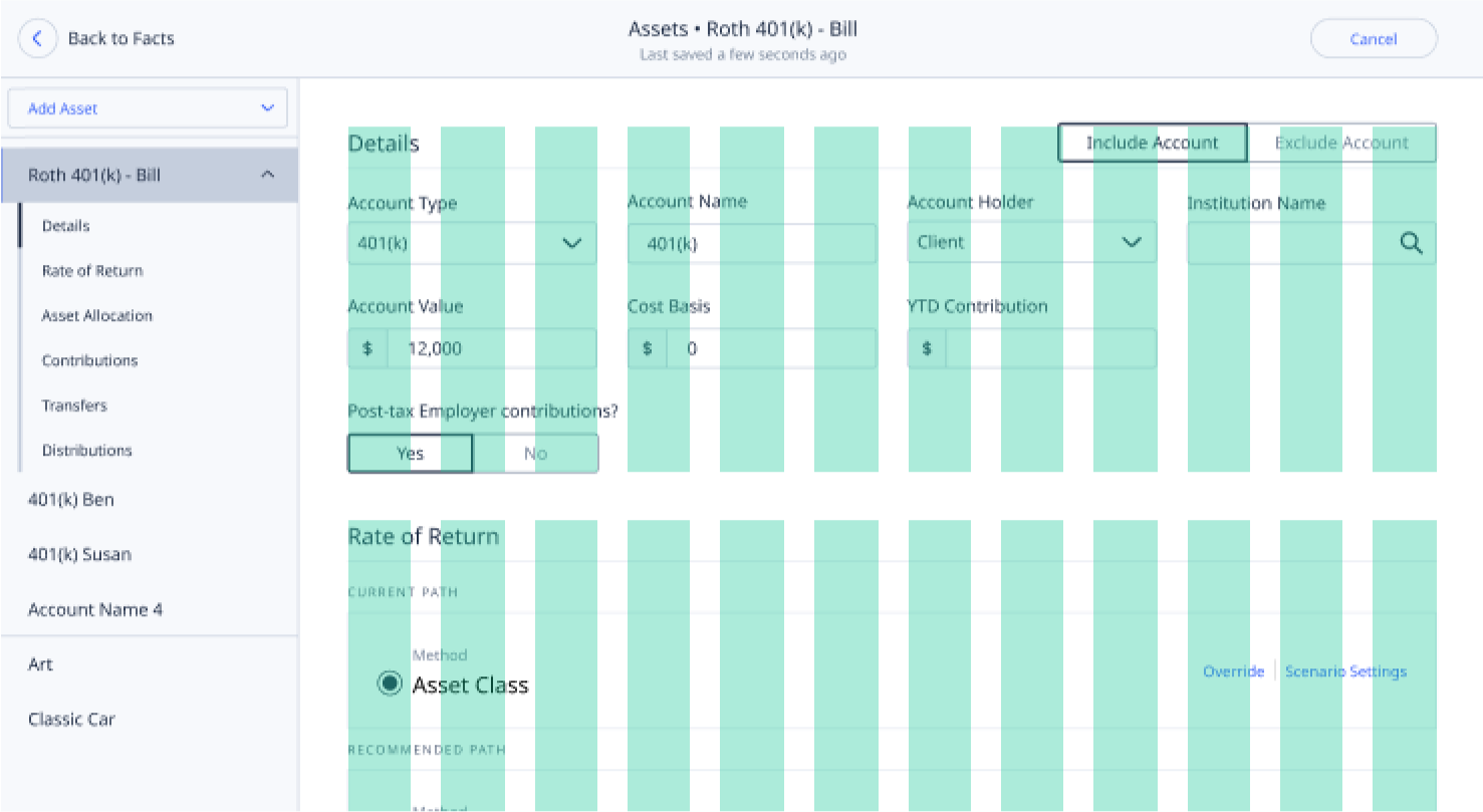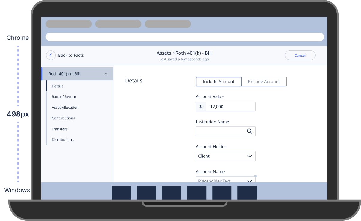With enhanced designs and a refined information architecture, I partnered closely with the Product Manager to create these solutions. We leveraged our monthly sessions with field members who highlighted issues with the page. Under the guidance of the User Experience Research (UXR) Lead, users were directed to establish 2 Roth 401(k) accounts, proceeded by 1 Savings account and then secondary assets. This approach aligns with the typical user workflow for adding client assets.