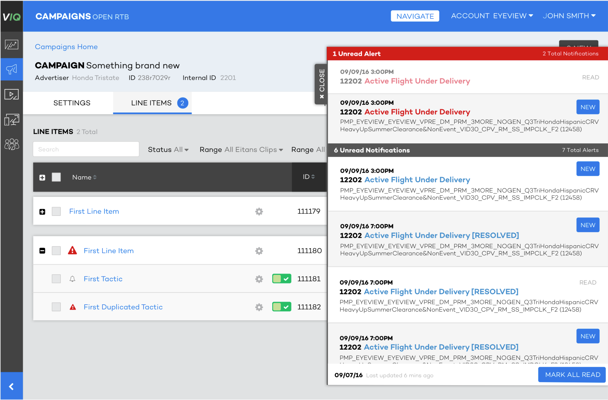During this time the complexity of Eyeview Campaigns increased and became more personalized, more vital operations were being conducted within the platform. It became aparent that there was a need to notify users of issues related to their workflows in a timely manner. I created a simple notification tool that alerted users to specific tasks in their workflow and offered actions in response.